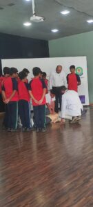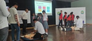 The students and teachers of the school were given training on when and how to give CPR. This pogramme aimed to acquaint students with Basic Emergency and Cardiac Arrest and its management.